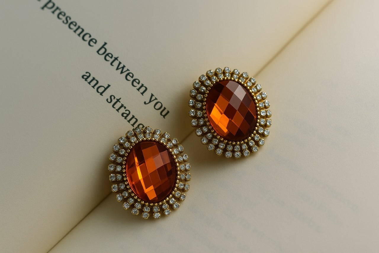 Unveil the regal charm of Amber Royale — a captivating pair of oval studs featuring rich, faceted amber-orange stones encased in a halo of shimmering crystals. Each piece is a radiant blend of vintage elegance and modern glamour, perfect for elevating your festive or formal look. Designed for the bold, the refined, and the unforgettable.