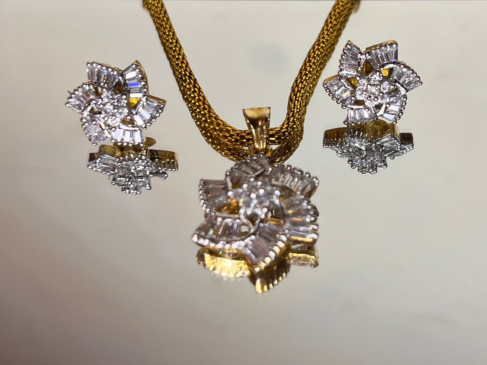 Delicate yet bold, Celestial Bloom brings floral elegance to life in glistening baguette-cut brilliance. Featuring a blooming flower design adorned with radiant cubic stones and a rich gold finish, this pendant and earring set captures the essence of celebration and charm. Perfectly styled for festive wear, wedding soirées, or refined gifting.