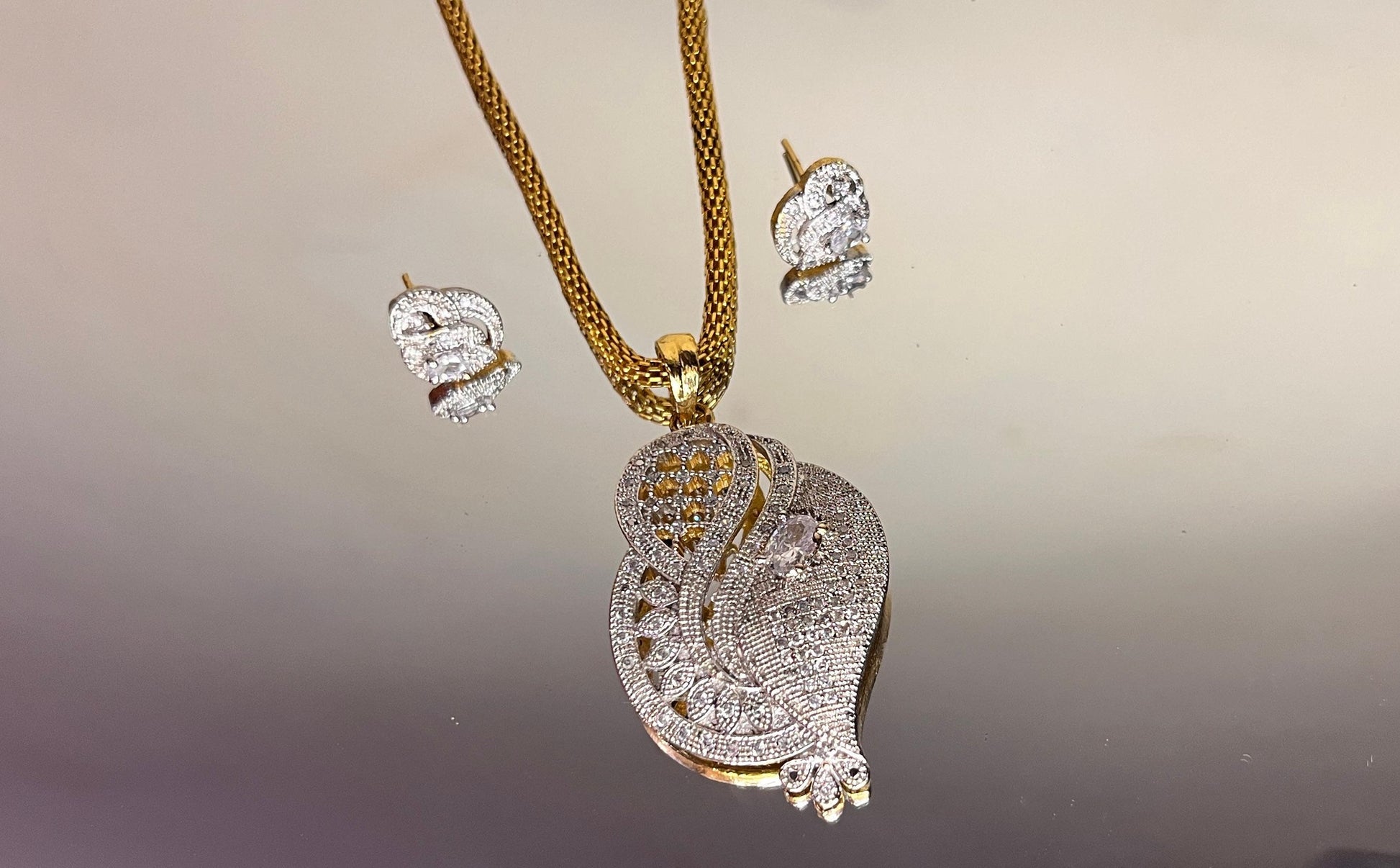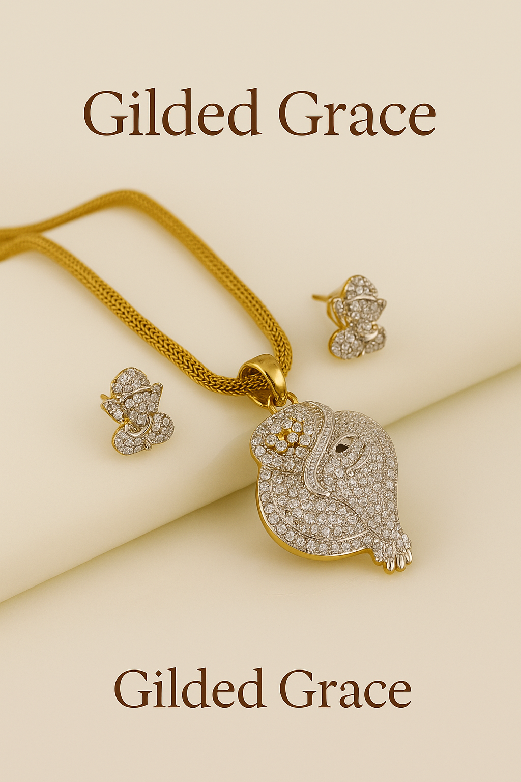 Embrace divine elegance with the Gilded Grace jewelry set — featuring a stunning Lord Ganesha pendant encrusted with sparkling stones, paired with matching earrings. Crafted with precision and finished in radiant gold tones, this set blends spiritual charm with timeless luxury — perfect for festive occasions or meaningful gifting.