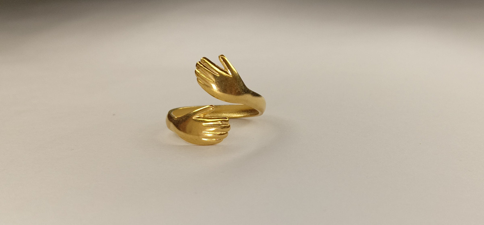 Unique gold-toned Hand Twist Ring designed with open-end palm detailing, finished with an anti-tarnish coating for long-lasting brilliance and wear.