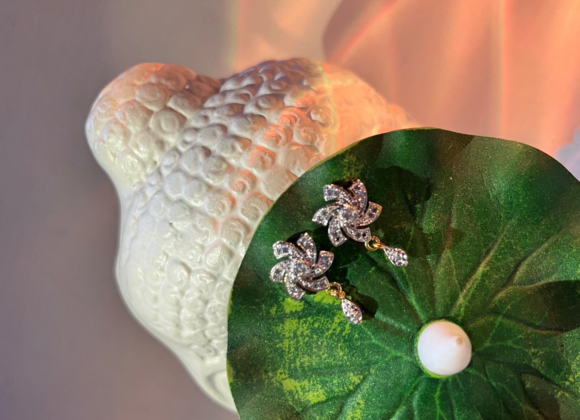 Designed in a floral swirl silhouette and encrusted with shimmering cubic stones, these studs bring a soft sparkle to your every move. The subtle drop detail adds just the right touch of grace and movement, making them perfect for both everyday luxury and special occasions.