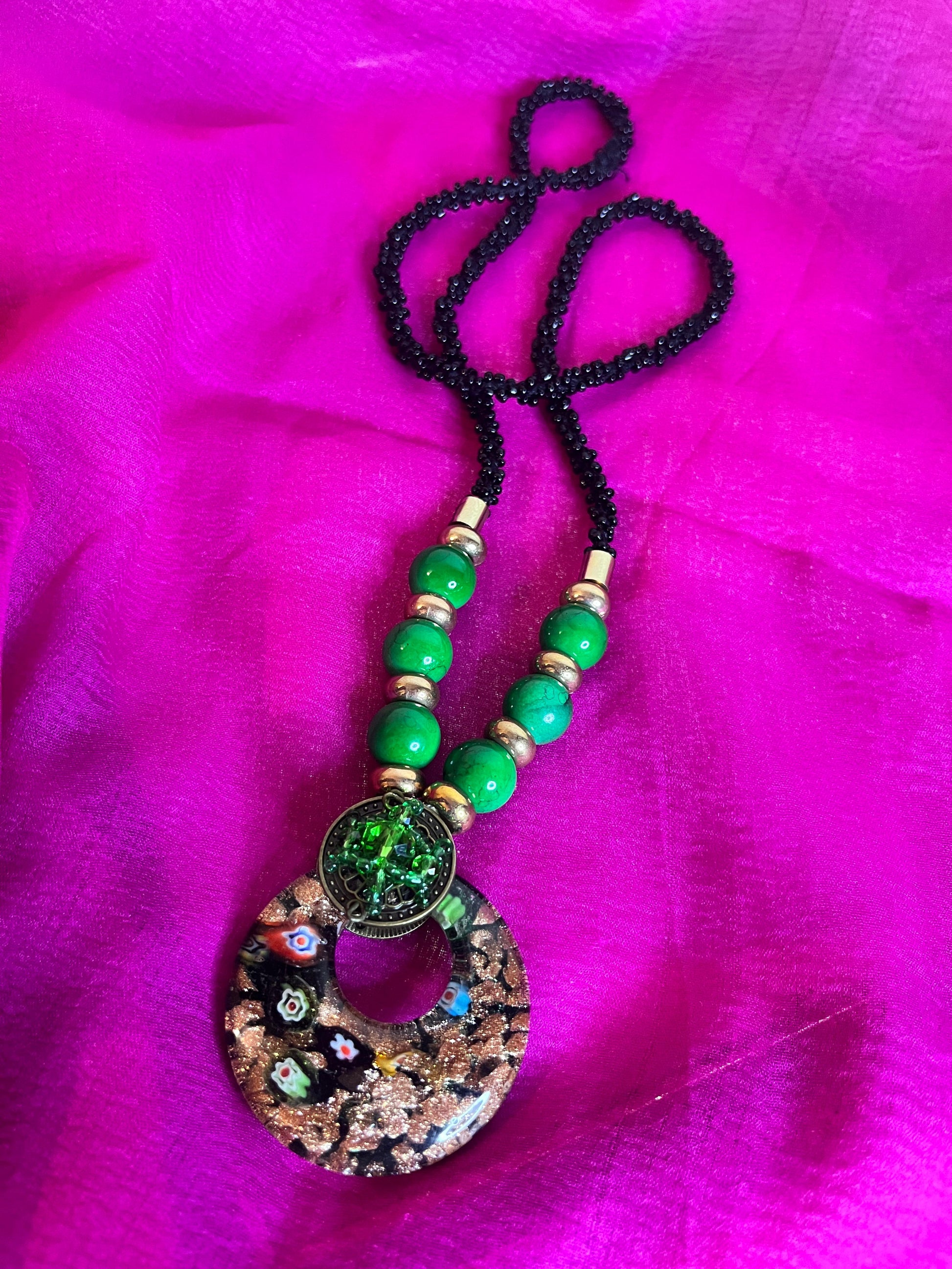 A captivating bohemian-style necklace featuring a vibrant mix of glossy green beads and intricate gold accents. The centerpiece is a large circular pendant with artistic floral detailing and flecks of metallic gold, creating a striking fusion of natural and artistic elements. Suspended on a jet-black beaded chain, this piece effortlessly blends tradition and contemporary charm — perfect for statement styling with ethnic or fusion wear.